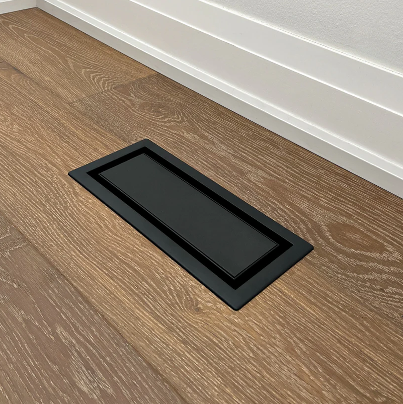 An innovative, ultra-minimalist alternative to grille vents that instantly upgrades floors, without the need for customization. Sleek black finish compatible with all flooring surfaces. Simply drop in. Super-easy, DIY-install. Retrofit anytime. Designed for use with the 4” x 10” Framed Floor Vent [Lite]. Replace with customized flooring later (or don’t — the choice is yours!)
