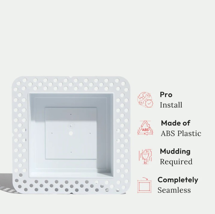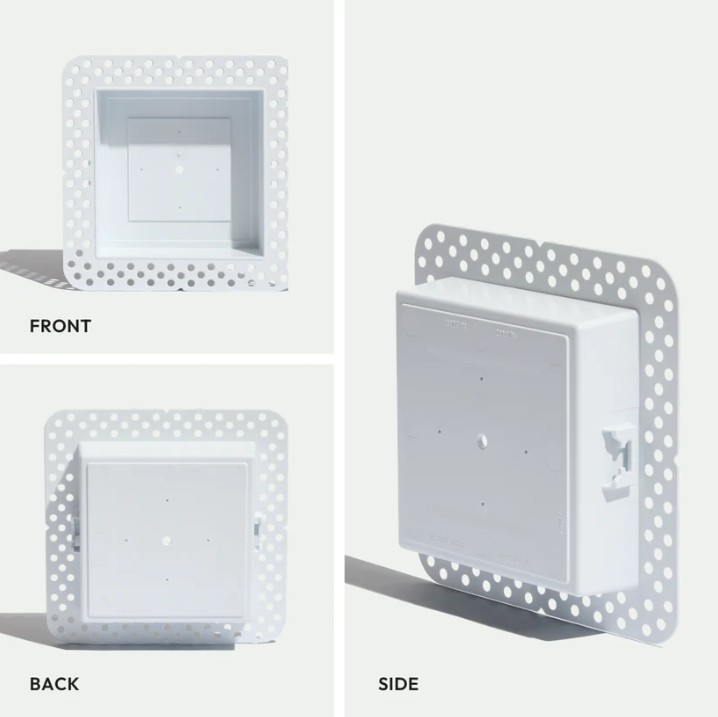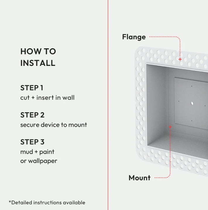 This is the Flush model. It requires mudding and sanding to achieve a flush finish, so it’s best tackled by someone experienced with drywall. If that’s not you, we recommend calling a pro! Alternatively, use the Framed Drywall Device Mount [Lite] — installation is simple and requires minimal tools. Just cut a hole in the drywall and fasten the device mount with the provided screws. Check our handy install guide for step-by-step instructions for both models.