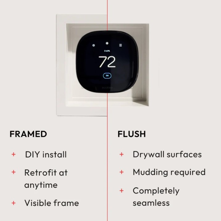 Ultra-minimalist device mount for smart thermostats such as Google Nest and ecobee and other small devices. Customizable, recessed ABS plastic mount with a flush finish for a seamless design that blends right into the wall or ceiling. Also an affordable alternative for recessed pot lights. Pro install in 30 minutes. Requires drywall mudding.