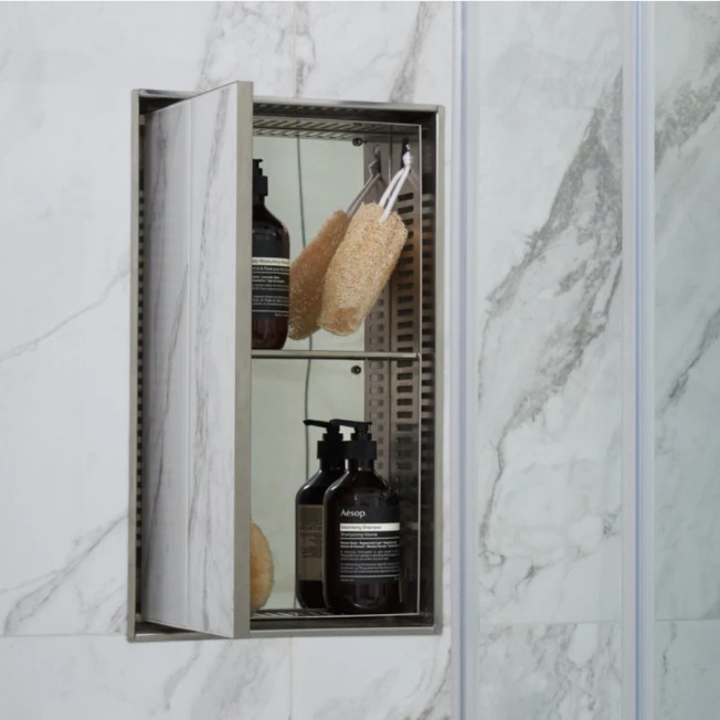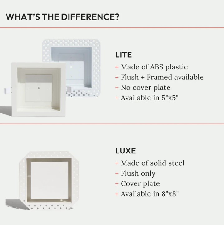 This is the Flush model, designed to be mudded in, creating a seamless, contoured look that blends into the wall, so it’s best installed by a professional. In comparison, the Framed model has a rim that sits on top of the wall surface, creating a visible border and allowing for an easy, DIY-friendly drop-in installation.