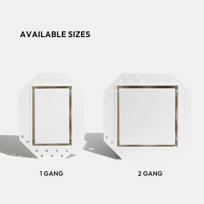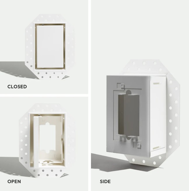 Ultra-minimalist receptacle mount for light switches, outlets, Ethernet and phone receptacles, and more. Customizable hinged door with a flush finish for a seamless design that blends right into the wall — once closed, only a rectangular groove is visible. Pro install in 30 minutes. Requires drywall mudding.