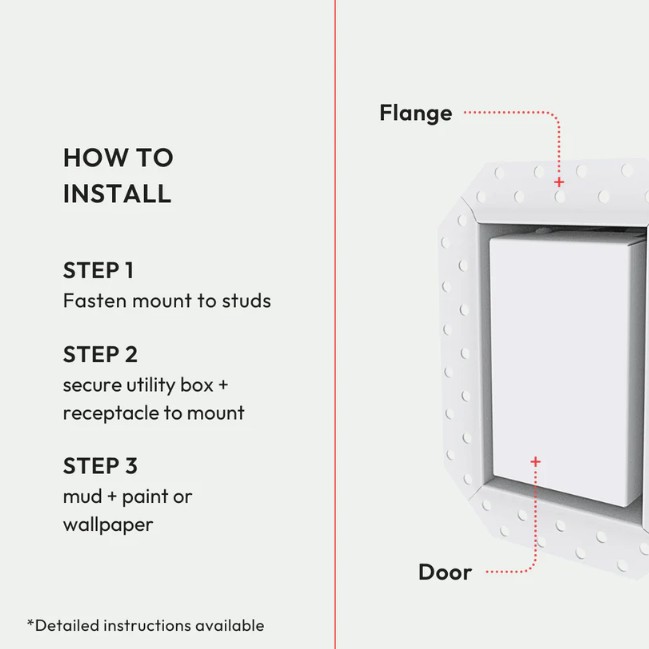 This is the Flush model, designed to be mudded in, creating a seamless, contoured look that blends into the wall, so it’s best installed by a professional. In comparison, the No-See Receptacle Mount has a rim that sits on top of the wall surface, creating a visible border and allowing for an easy, DIY-friendly drop-in installation.