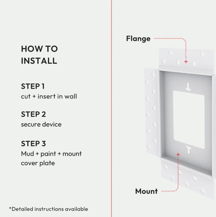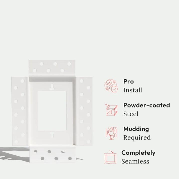 Ultra-minimalist device mount for a seamless design that recesses light switches, outlets, Ethernet and phone receptacles, and more. Customizable powder-coated steel panel with a flush finish blends right into the wall. Pro install in 30 minutes. Requires drywall mudding.