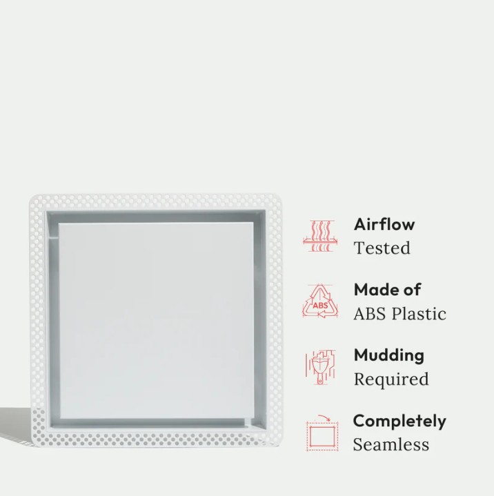 This product is a flush air vent for walls and ceilings, designed specifically for drywall or gypsum applications. If you’re working with other materials, use the Framed Exhaust Mount [Lite] or Framed Exhaust Mount [Luxe] — these are compatible with any surface.