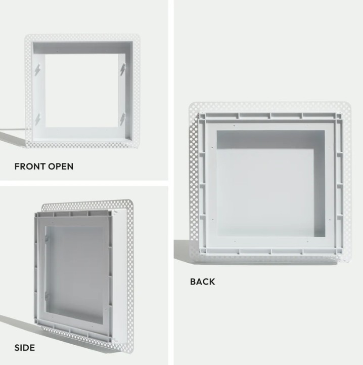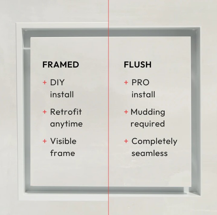 This is the Flush model, which sits level with the wall surface. It requires drywall mudding and sanding to create a seamless, contoured look that blends into the wall, so it’s best installed by a professional. In comparison, the Framed model has a rim that sits on top of the wall surface, creating a visible border and allowing for an easy, DIY-friendly drop-in installation.