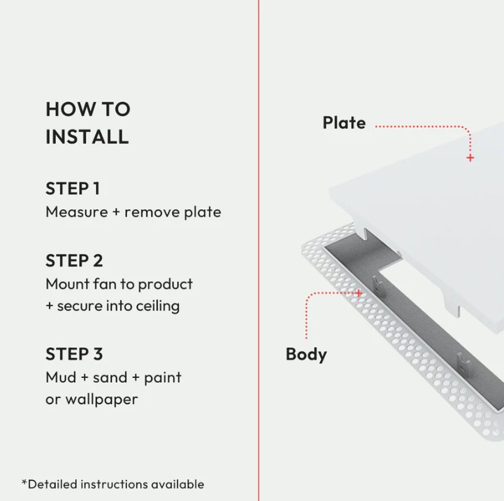 This is the Flush model. It requires mudding and sanding to achieve a flush finish, so it’s best tackled by someone experienced with drywall. If that’s not you, we recommend calling a pro! Alternatively, use the Framed Exhaust Mount [Luxe] — installation is simple and requires minimal tools. Just cut a hole in the drywall (if needed) and fasten with the provided screws. Check our handy install guide for step-by-step instructions for both models.