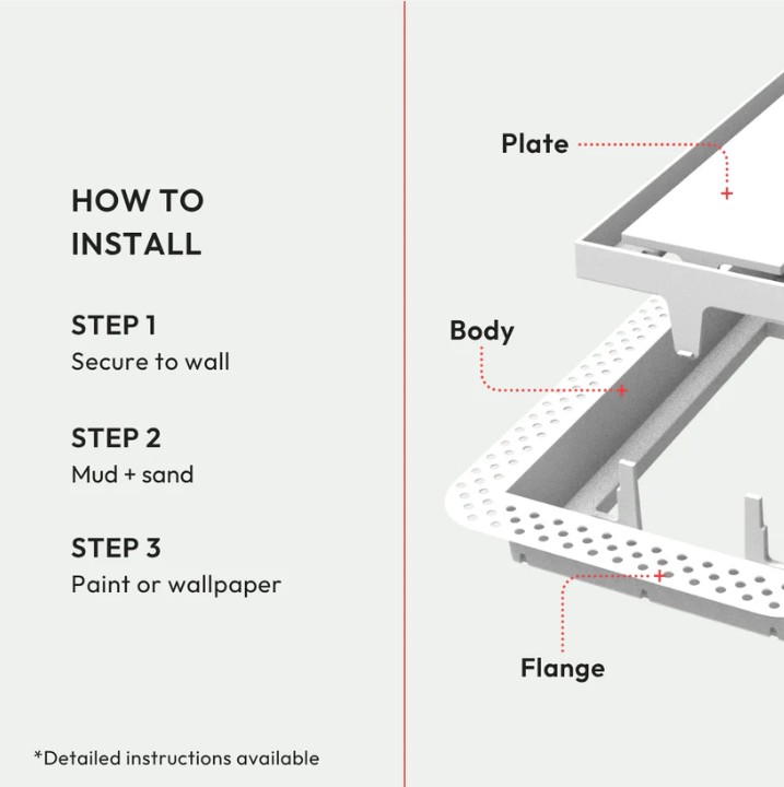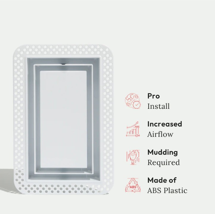 With a paintable center plate that hides the vent in plain sight — once installed, all you see is a clean rectangular air channel. The Flush is a subtle upgrade that makes a big design impact. Pro install in 30 minutes. Requires drywall mudding. Drywall and HVAC-compatible.