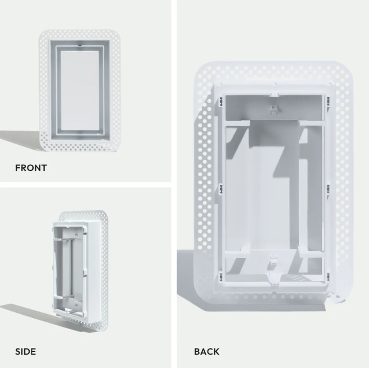 This is the Flush model, designed to sit level with the wall surface. It requires mudding and sanding for a seamless finish, so it’s best installed by a pro. In contrast, the Framed model features a rim that sits on top of the wall, making it a great option for quick, easy, DIY installation.