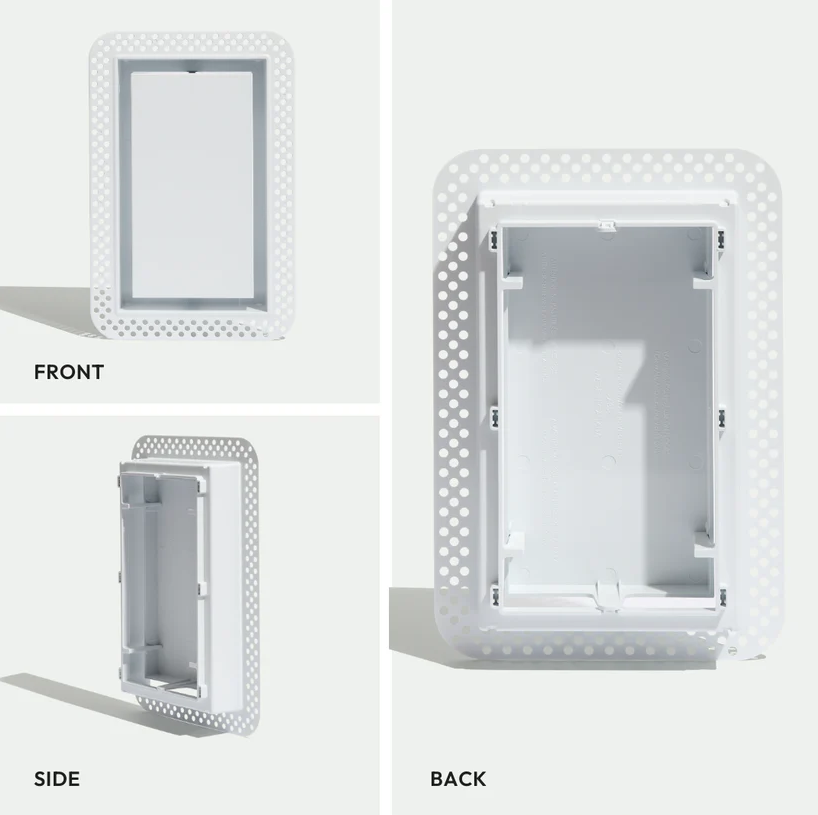 This is the Flush model, designed to sit level with the wall surface. It requires mudding and sanding for a seamless finish, so it’s best installed by a pro. In contrast, the Framed model features a rim that sits on top of the wall, making it a great option for quick, easy, DIY installation.