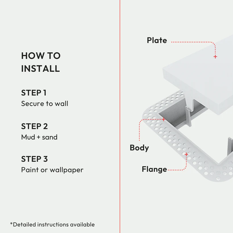 This is the Flush model. It’s an ultra-minimal wall vent that requires mudding and sanding to achieve a flush finish, so it’s best tackled by someone experienced with drywall. If that’s not you, we recommend calling a pro! Prefer a more DIY-friendly option? Go with the Framed Wall Vent [Lite]. It installs easily with just a few basic tools—just drop it into the duct and secure it with the included screws.