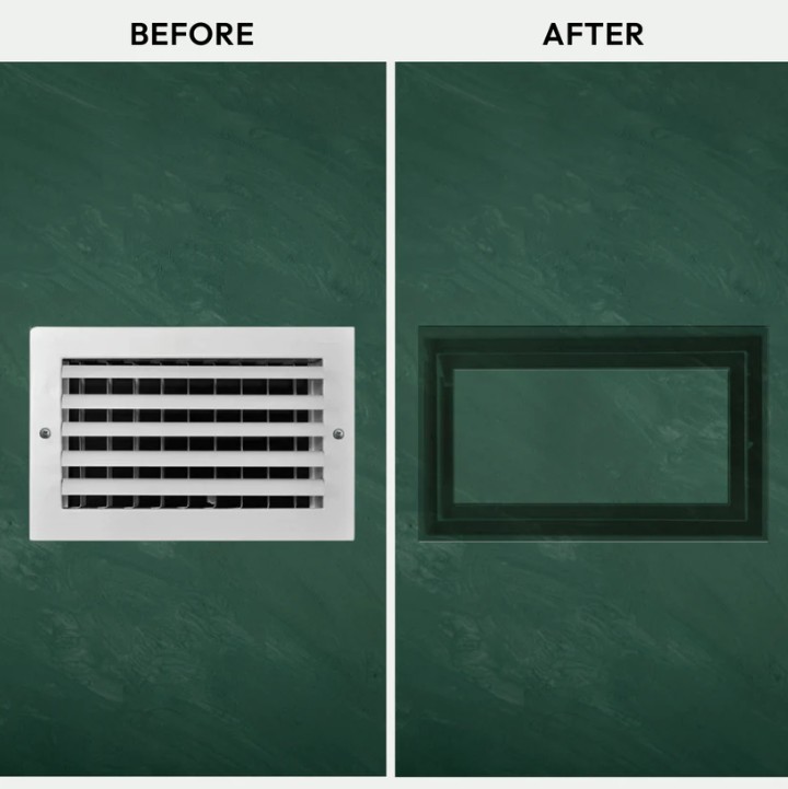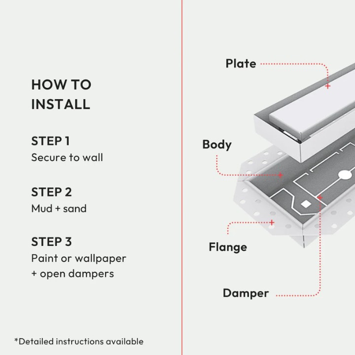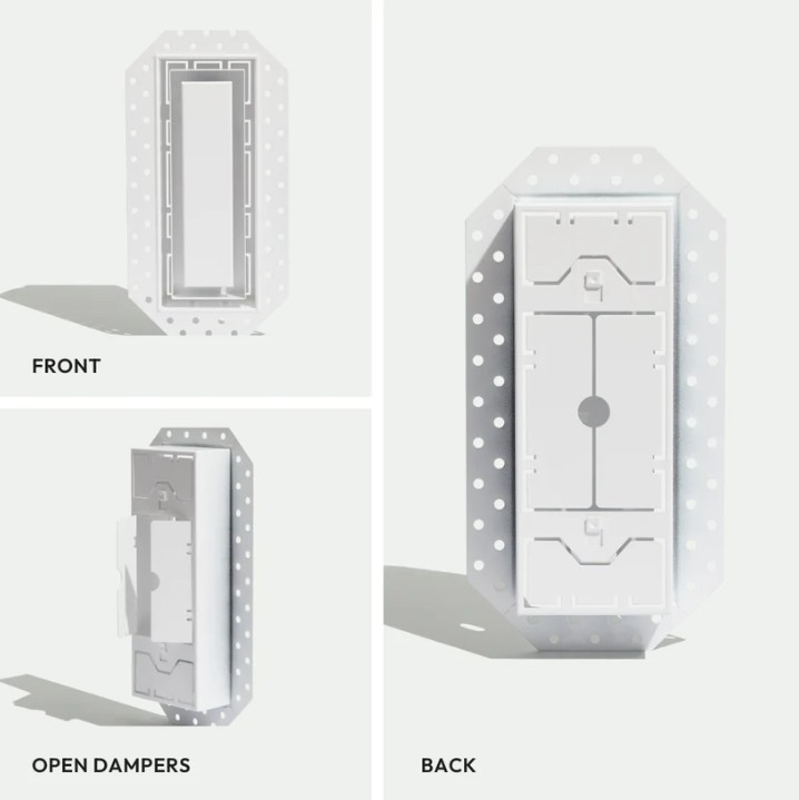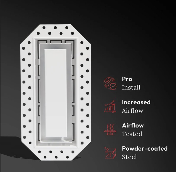 With a paintable center plate that hides the vent in plain sight, once installed, all you see is a clean rectangular air channel. The Flush is a refined upgrade that seamlessly integrates into the wall. Pro install in 30 minutes. Requires drywall mudding. Drywall and HVAC-compatible.