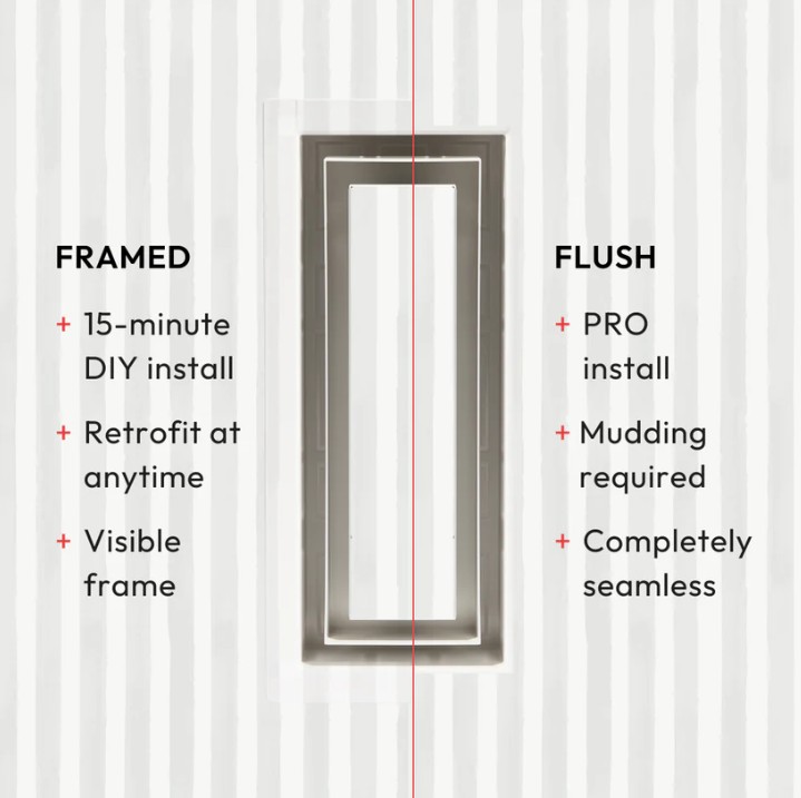 This is the Flush model, designed to sit level with the wall surface. It requires mudding and sanding for a seamless finish, so it’s best installed by a pro. In contrast, the Framed model features a rim that sits on top of the wall, making it a great option for quick, easy, DIY installation.
