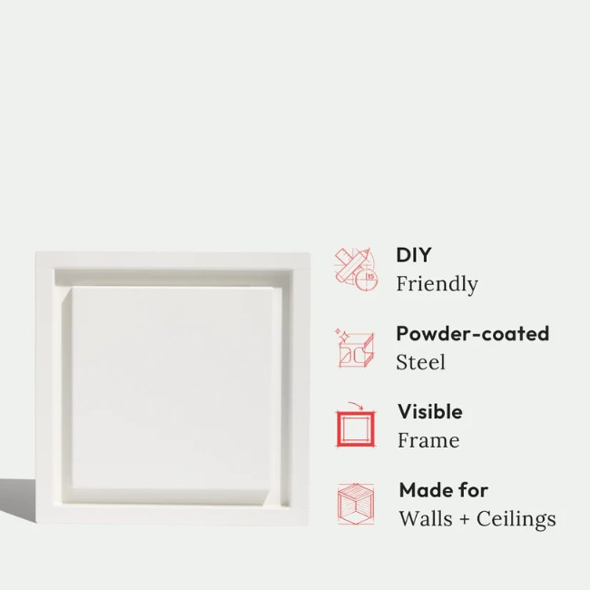 Ultra-minimalist universal access panel for a seamless design to hide access to electrical panels, plumbing pipes, and crawl spaces in plain sight. Customizable center plate with a framed finish blends right into the wall or ceiling. Super-easy, DIY-install in 15 minutes. Retrofit anytime. Drywall-compatible.