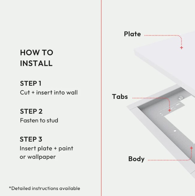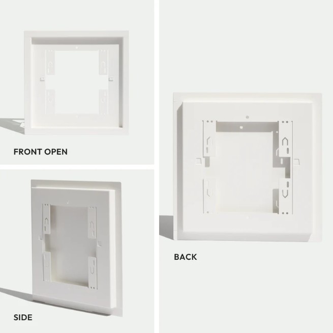 This is the Framed model — installation is simple and requires minimal tools. Just cut a hole in the drywall and fasten the panel with the provided screws. In comparison, the Flush model requires a bit more skill with mudding and sanding, so it’s best tackled by someone experienced with drywall. (If that’s not you, we recommend calling in a pro!) Check our handy install guide for step-by-step instructions for both models.