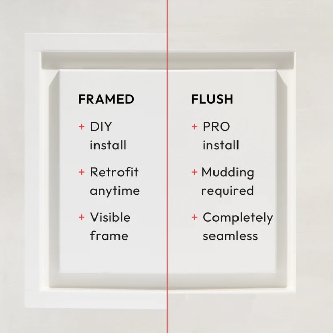 This is the Framed model, with a rim that sits on top of the wall surface and remains visible after install, creating a visible border and allowing for an easy, DIY-friendly drop-in installation. In comparison, the Flush model sits level with the surrounding surface, requiring drywall mudding and sanding for a seamless aesthetic.
