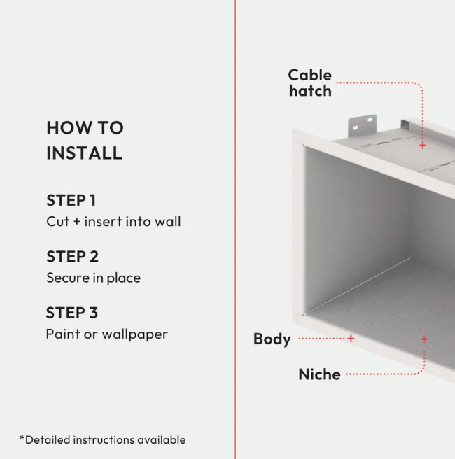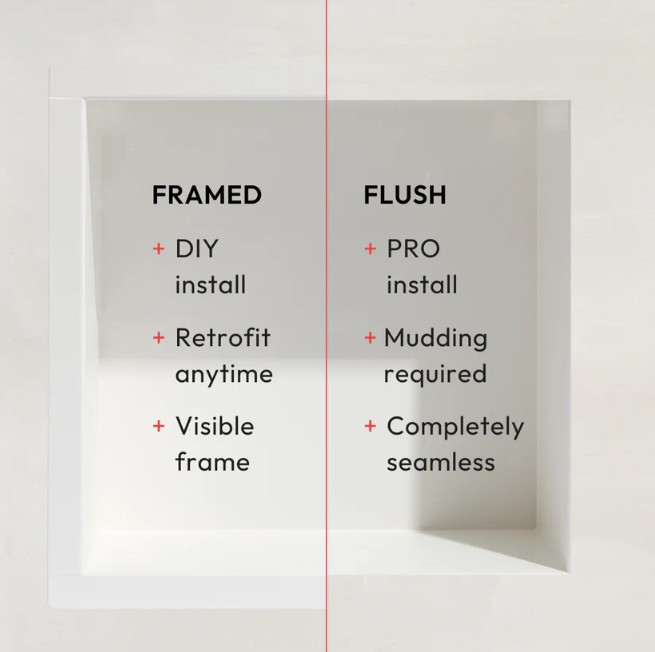 This is the Framed model — installation is simple and requires minimal tools. Just cut a hole in the drywall and fasten the niche with the provided screws. In comparison, the Flush model requires a bit more skill with mudding and sanding, so it’s best tackled by someone experienced with drywall. (If that’s not you, we recommend calling in a pro!) Check our handy install guide for step-by-step instructions for both models.