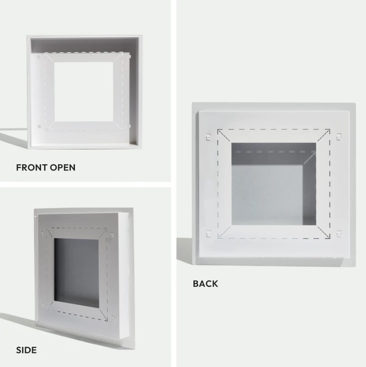 This is the Framed model — installation is simple and requires minimal tools. Just cut a hole in the drywall (if needed) and fasten with the provided screws. In comparison, the Flush model requires a bit more skill with mudding and sanding, so it’s best tackled by someone experienced with drywall. (If that’s not you, we recommend calling in a pro!) Check our handy install guide for step-by-step instructions for both models.