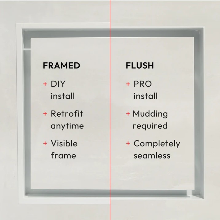 This is the Framed model, with a rim that sits on top of the wall surface, creating a visible border and allowing for an easy, DIY-friendly drop-in installation. In comparison, the Flush model sits level with the wall surface, requiring drywall mudding and sanding for a seamless, contoured look that blends into the wall.