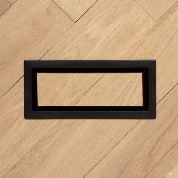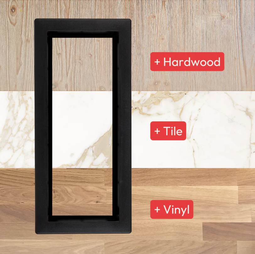 This is the Framed model — installation is simple and requires minimal tools. Just cut a piece of your flooring material, glue it onto the vent’s inner tray, and screw it in for super-easy, DIY framed floor vent installation. In comparison, the Flush model needs to be professionally mounted at the subfloor level, before installing the surface material. Check our handy install guide for step-by-step instructions for both models.
