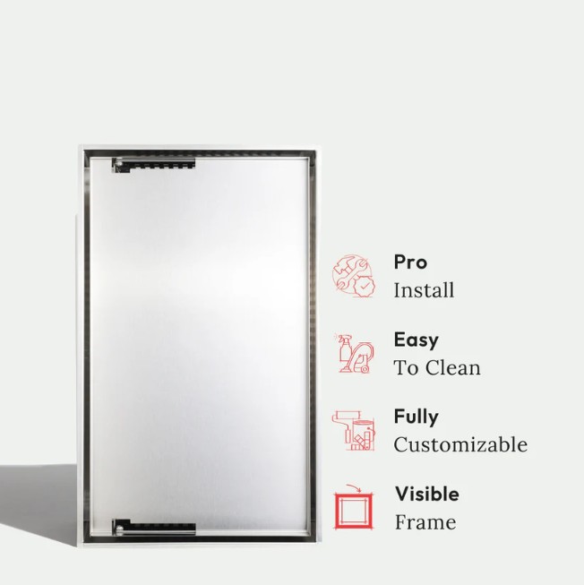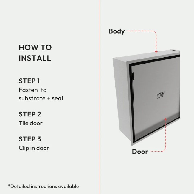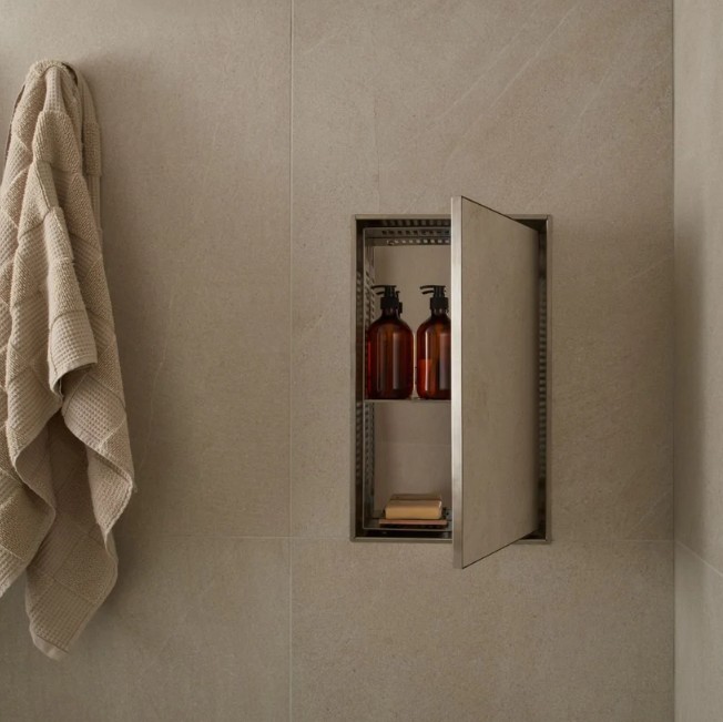 Ultra-minimalist, seamless niche to conceal shower essentials for a clean aesthetic (see what we did there?) whilst optimizing space. A recessed cubby with a customizable hinged door blends right into the shower wall — once closed, only a rectangular groove is visible. Pro install in 30 minutes. Tiling and waterproofing required.